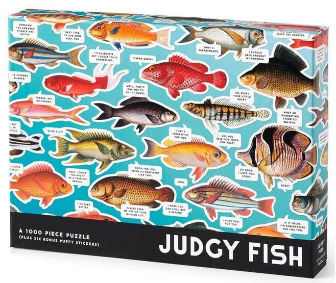A Galison 1000 db-os puzzle - Judgy Fish 1000 Piece Puzzle (77202) vicces és különc halainak mindenről megvan a véleményük. Ez a humorral fűszerezett, egyedi hangulatú kirakó könnyed, vidám kikapcsolódást nyújt.