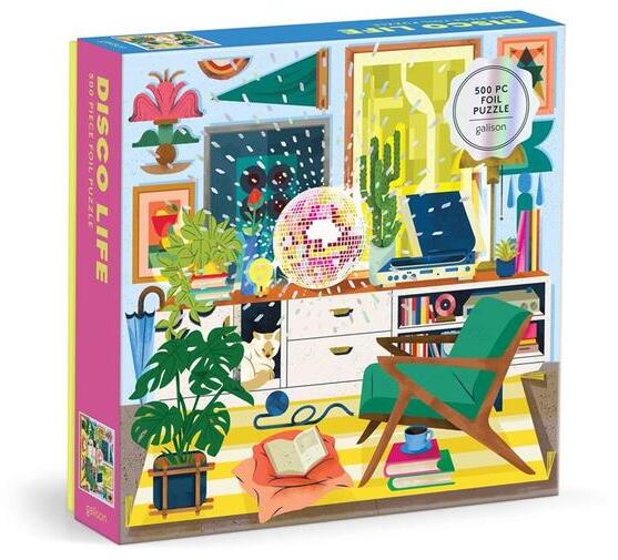 A Galison 500 db-os Fóliás puzzle - Disco Life (84712) kirakó képe rögtön magával ragad trendi retró bájával! A fényes fóliával díszített képen egy vagány diszkógömb koronázza meg a vidám, színes szoba hangulatát.
