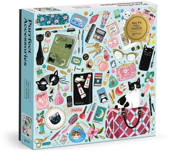 Stílusos és elegáns kiegészítők, csecsebecsék és macskák mindenhol! A Galison 500 db-os Fóliás puzzle - Purrfect Accessories (84293) kirakó képén egy cicaimádó táskájának tartalma tárul elénk, arany fóliával díszítve az igazi luxus érzésért.