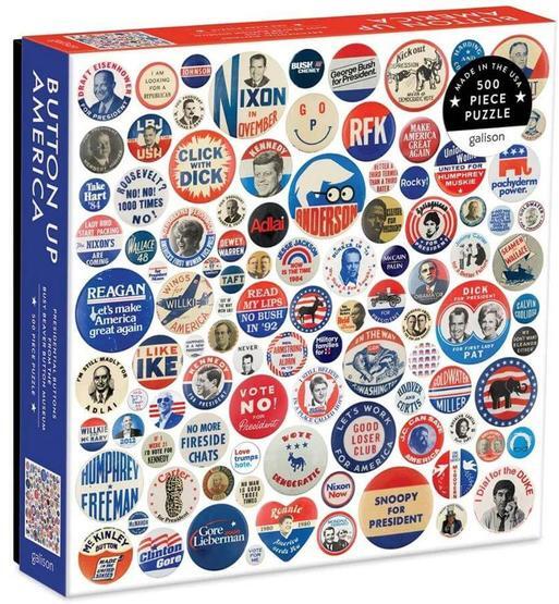 Amerikai választási kitűzők lenyűgöző kollázsa elevenedik meg a képen, izgalmas szlogenekkel és ikonikus elnökök képével. A Galison 500 db-os puzzle - Button Up America (66428) vagány és látványos.