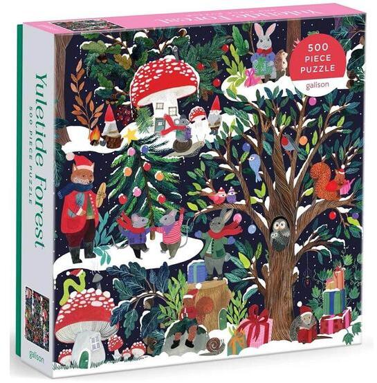 A Galison 500 db-os puzzle - Yuletide Forest (83425) varázslatos hangulatot idéző képén a téli erdő lakói ünnepi díszekkel és ajándékokkal készülnek a karácsonyra. Fedezd fel a kép mesés részleteit és hangolódj te is az ünnepekre!