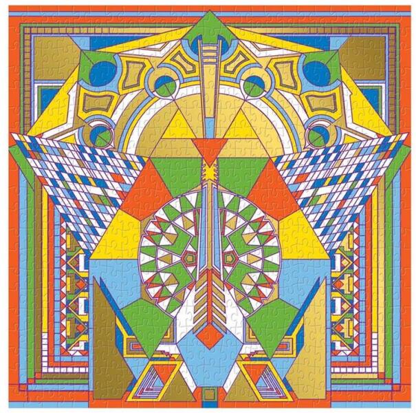 Frank Lloyd Wright híres pávás szőnyegmintája elevenedik meg a Galison 500 db-os Fóliás puzzle - Imperial Hotel Peacock Rug (57815) kirakón elegáns, geometrikus formáival és arany fóliával díszítve.