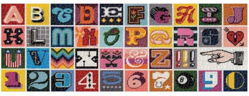 Hímzésmintákból álló betűk sorakoznak egymás mellett á-tól z-ig a Galison 65308 - Needlepoint A to Z - 1000 db-os panoráma puzzle színes és kreatív panorámaképén. Tökéletes választás a kézimunka és a kirakózás szerelmeseinek.