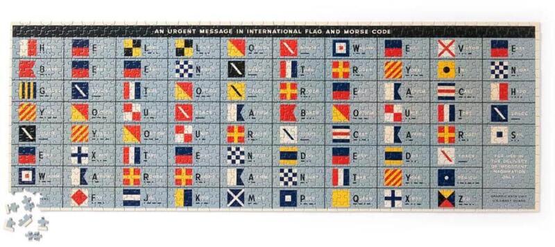 A nemzetközi zászlókód és a Morse-ábécé látható betűnként a Galison 75826 - An Urgent Message - 1000 db-os panoráma puzzle képén. Az egyedi és részletgazdag kirakó segítségedre lesz, ha egy titkos üzenetet szeretnél küldeni!