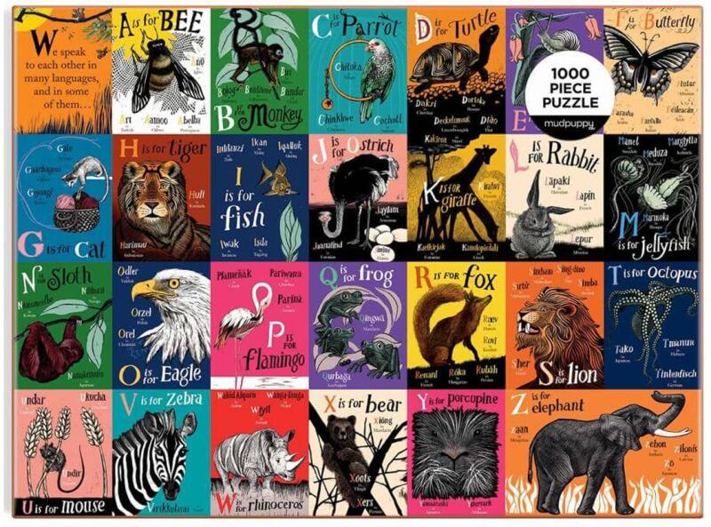 Egyedi ábécés illusztrációk mutatják be a betűk és állatok világát egy kis csavarral a Galison 76281 - Mudpuppy - A is for Bee - An Alphabet in Translation - 1000 db-os puzzle képén. Ez a vidám kirakó kreatív és játékos tanulási élményt nyújt, sokféle nyelven megismerhetjük az állatok nevét.