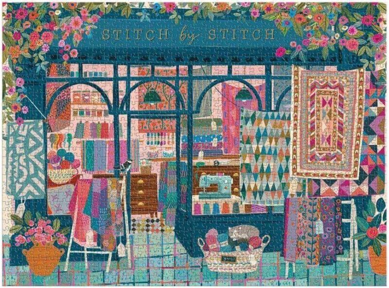 A kézimunka szerelmeseinek álma a Galison 1000 db-os puzzle - Stitch by Stitch (78452) című kirakón megelevenedő hangulatos méteráru üzlet.