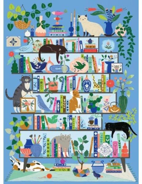 Cica- és növényimádó könyvmolyoknak készült a Galison 1000 db-os puzzle - Purrfect Nook (82725) kirakó. Flora Waycott illusztrációján egy hangulatos könyvespolc kel életre cuki macskákkal, szépséges növényekkel és csecsebecsékkel.