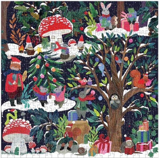 A Galison 83425 - Yuletide Forest - 500 db-os puzzle varázslatos hangulatot idéző képén a téli erdő lakói ünnepi díszekkel és ajándékokkal készülnek a karácsonyra. Fedezd fel a kép mesés részleteit és hangolódj te is az ünnepekre!