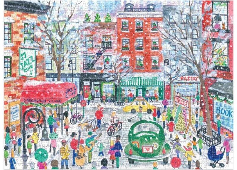 New York ünnepi forgataga jelenik meg Storrings Michaelrajzán. A Galison 86099 - Christmas in Greenwich Village- 1000 db-os puzzle hangulatos, részletgazdag karácsonyi jelenetével te is karácsonyi hangulatba kerülsz majd.