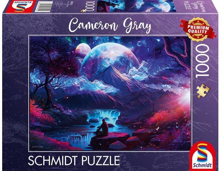 A Schmidt 1000 db-os puzzle - Whispering in the Sky  című kép Cameron Gray alkotása. Ebben a lenyűgöző fantáziavilágban hatalmas bolygók töltik be az eget a ragyogó folyó és felhőkbe burkolózó hegyek fölött.