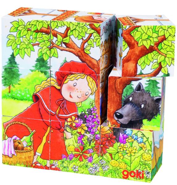 A fa mesekocka 9 kocka elemét forgatva híres mesék egy-egy jelenetét tudjuk összeállítani.