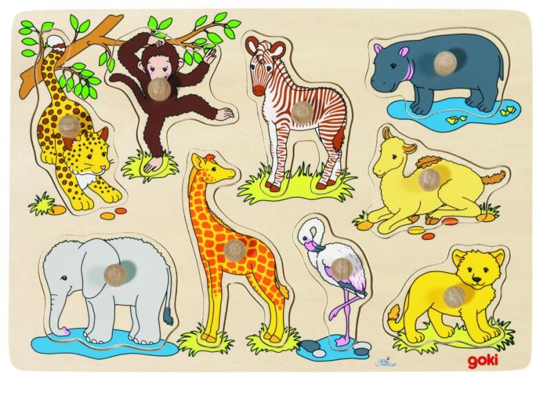 Fogantyús fa kirakó játék 9 kedvelt képpel. Színes, barátságos figurák, a picik kezéhez igazodó