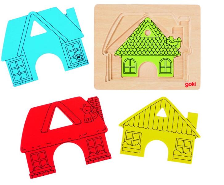 A fa kirakó játék 4 kisebb-nagyobb házikót tartalmaz, melyet helyes sorrendben kell a keretbe egymás alá-fölé helyezni. A kisebb-nagyobb fogalom megtanulása mellett alkalmas a színek rögzülésére is. Az apró kezek koordinációja is fejlődik a fa kirakó játék elemek keretbe illesztése során.