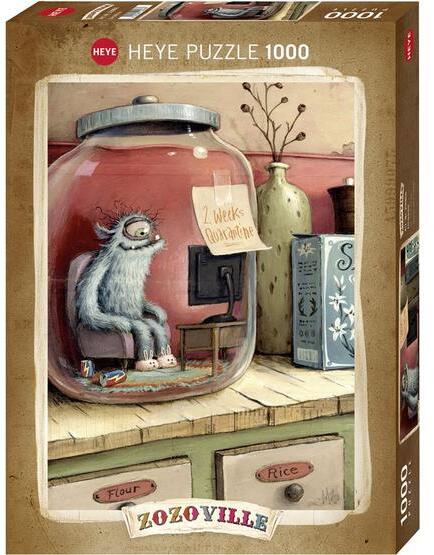 A  Heye - Zozoville - Jarantine  1000 db-os   puzzle képén a berlini Zozoville galéria egyik gyöngyszeme látható, melyen a kedves kis szörny két hét karanténba került.