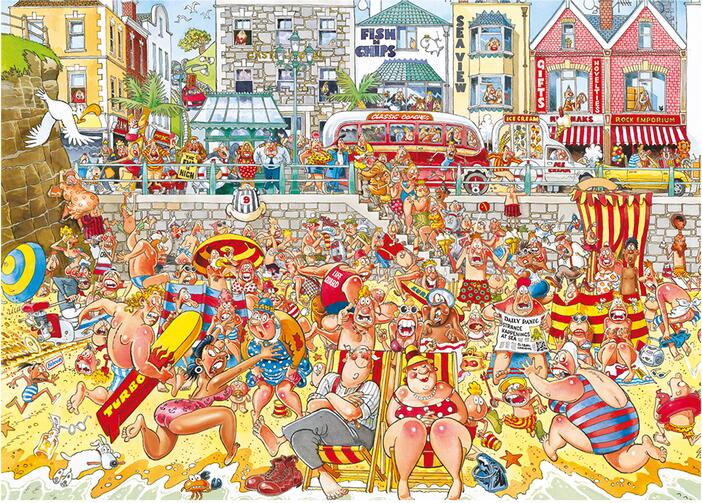 A holland  Jumbo Group  gyönyörű és részletgazdag kirakókat gyárt különféle stílusokban. Modern és színes illusztrációkat kínál híres művészektől, valamint különleges kollekciók is megtalálhatóak termékeik között. A cég az innováció és magas minőség mellett nagy gondot fordít az környezetvédelemre is, kirakóik újrahasznosított anyagok felhasználásával készülnek. A  Jumbo 1000 db-os puzzle - Wasgij Dagály (00328)  című képen egy zsúfolt strand látható.