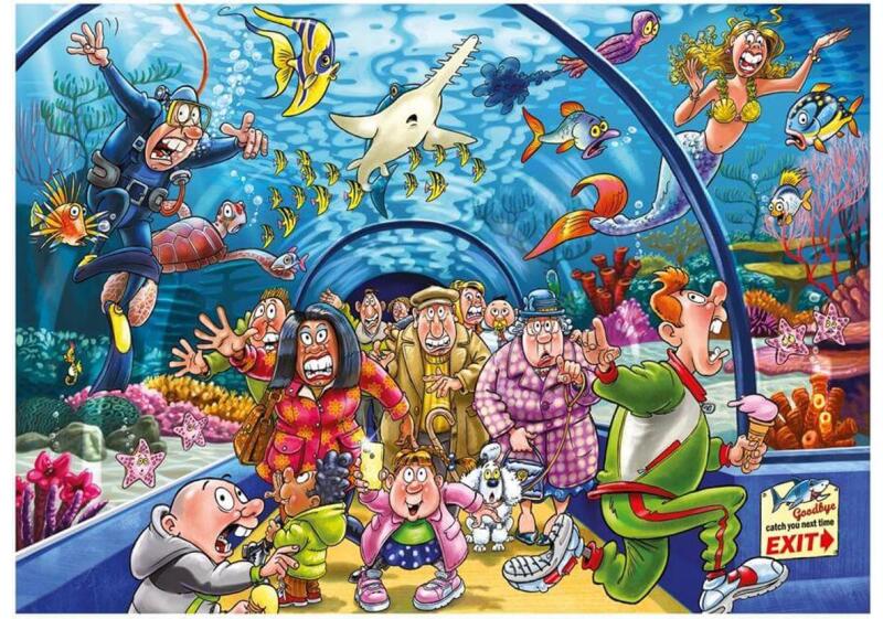 A Jumbo 00585 - Wasgij 43 - It smells like fish - 1000 db-os puzzle akváriumában túl sok a riadt arc. Vajon mi történhetett? Próbáld meg kitalálni, miközben kirakod a képet, amit a többiek látnak.