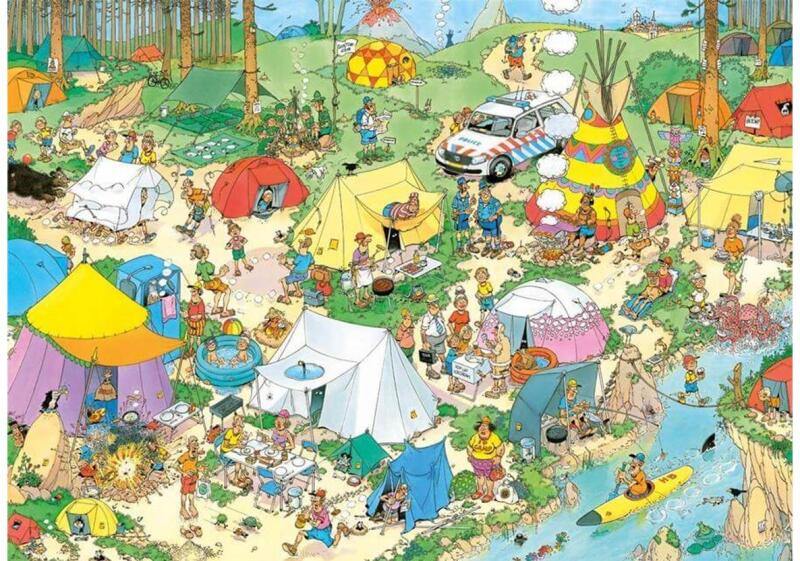 Egy erdei kemping humoros jelenetei elevenednek meg a Jumbo 00603 - Jan van Haasteren - Camping in The Forest - 1000 db-os puzzle képén. Minden sátor mögött újabb vidám történet bontakozik ki, fedezd fel mind!