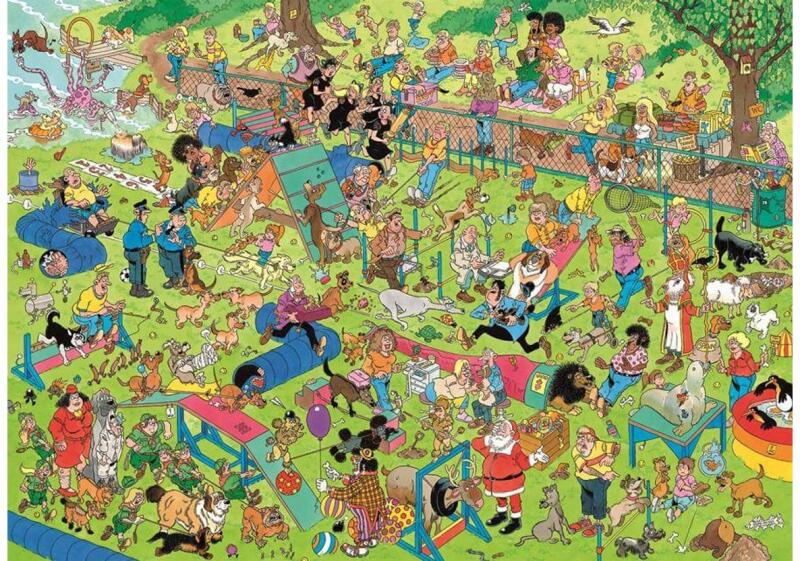 Egy kutyás akadálypálya, ahol a házi kedvencek túlszárnyalják gazdáikat. A Jumbo 00624 - Jan van Haasteren - Dog Parkour - 1000 db-os puzzle jelenete vidám és energikus.