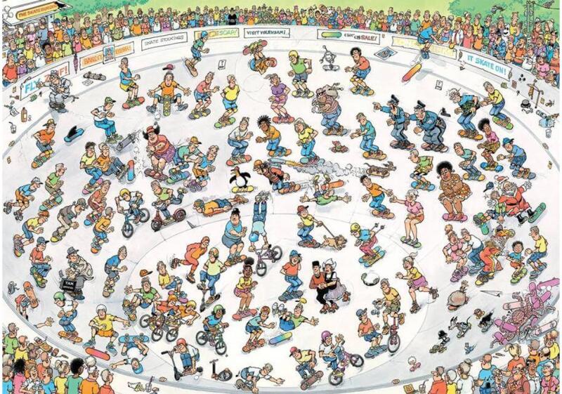 A Jumbo 00625 - Jan van Haasteren - Riding the Skate Bowl - 1000 db-os puzzle gördeszkaparkjában mindenki próbálja túlélni a trükköket. Itt a fiatalok és idősek egyaránt részei a kaotikus szórakozásnak.