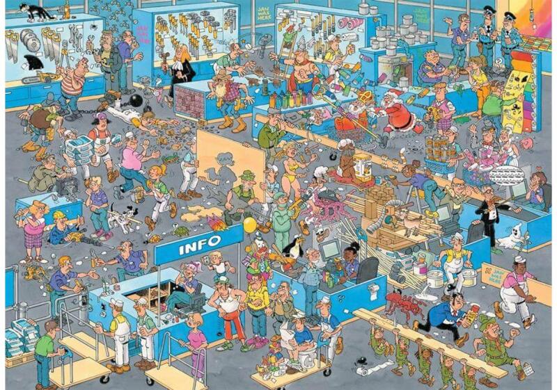 Egy barkácsbolt két különböző jelenettel, tele katasztrofális helyzetekkel. Fedezd fel a sok-sok humoros jelenetet és kapcsolódj ki a Jumbo 00647 - Jan van Haasteren - DIY Shop - 2 x 1000 db-os kirakóval !