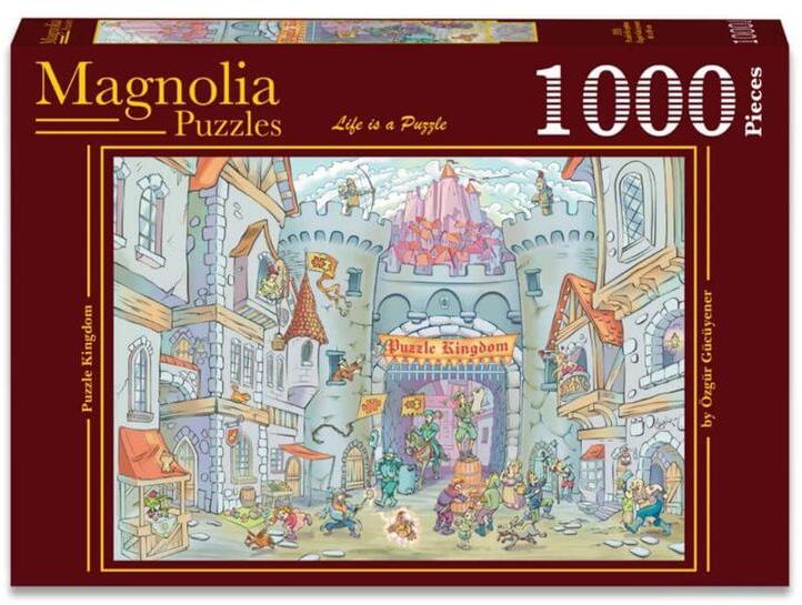 Egy mesebeli királyság tárul elénk tornyos kastéllyal és élénk színes részletekkel. A Magnolia 1000 db-os puzzle - Puzzle Kingdom (1034) jelenete a fantázia világát idézi, tele kalanddal és varázslattal.