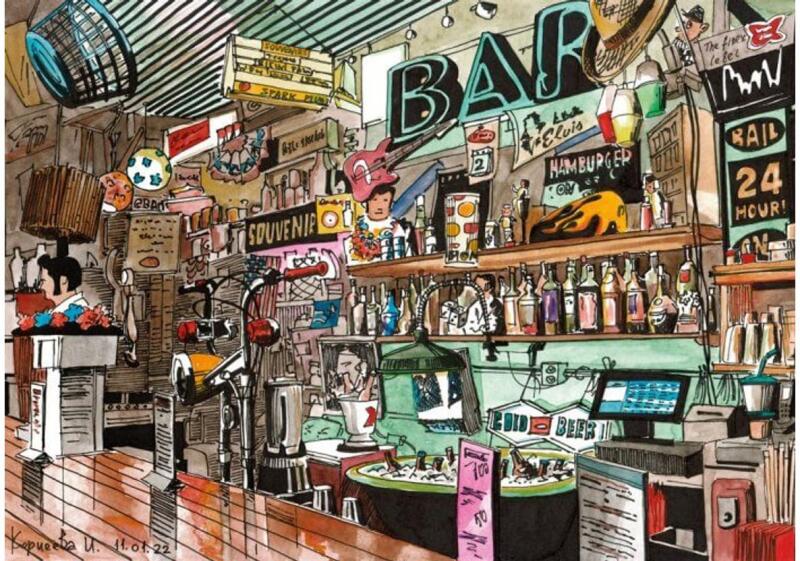 Egy hangulatos bár elevenedik meg italokkal és sok apró felfedeznivalórészlettel . A  Magnolia 7002 - Bar - 1000 db-os puzzle képe városi éjszakák hangulatát idézi.