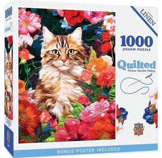 Egy szépséges cica bújik meg a színes virágoskertben. A MasterPieces 1000 db-os puzzle - Quilted - Flower Garden Hiding (72451) patchwork-szerű kompozíciója részletgazdag és elbűvölően bájos.