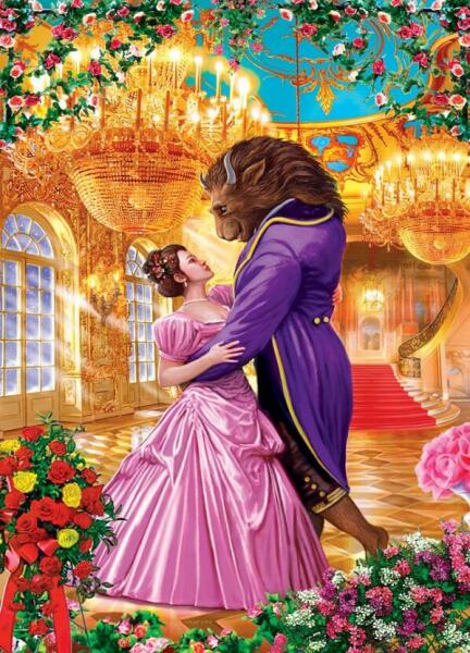 A MasterPieces 1000 db-os puzzle - Beauty and the Beast című képen a tündérmesék híres karakterei, Szépség és a Szörnyeteg látható.