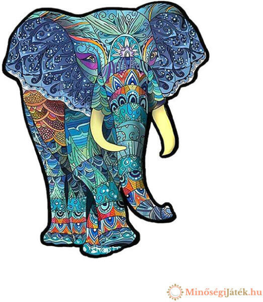 Modern jigsaw puzzle felnőtt kirakós-rajongók számára. Gyönyörű absztrakt mintázatú elefánt kép A4 méretben 150 darabból, melyek között állatfigurák is vannak.