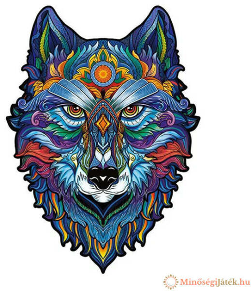 Modern jigsaw puzzle felnőtt kirakós-rajongók számára. Gyönyörű absztrakt mintázatú farkas kép A4 méretben 150 darabból, melyek között állatfigurák is vannak.