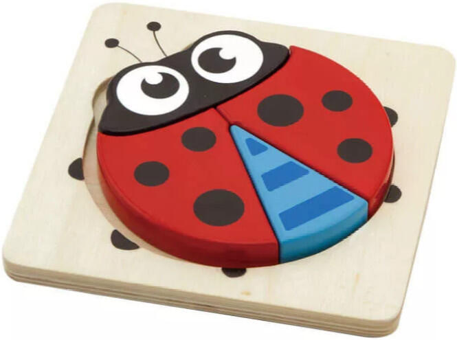 RAKTÁRRÓL AZONNAL! Katica formát ábrázoló puzzle magasított kivitelben. Alapanyagát tekintve fából készült, a használt festékanyag nem tartalmaz egészségre káros anyagokat, így az teljesen biztonságos a kisgyermekek számára is. Magasított kivitelének köszönhetően könnyen kézbe tudják venni a kisgyerekek. Kimondottan népszerű fejlesztő játék, mivel számos területen fejlesztő hatással bír. Segíti a finommotorikus és szenzormotorikus készséget, a megfigyelőkészséget, a szín és forma felismerést . Ezeken felül rávezeti a kisgyermeket a logikus gondolkodásra, a rész-egész, kisebb-nagyobb fogalmának megértésére . Mérete: 14,5x14,5x1,8 cm 2-4 éves korig