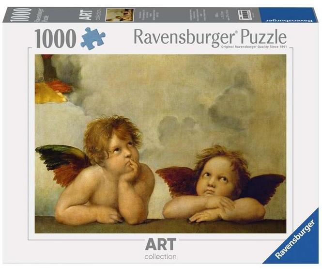 A puzzle Raffaello híres „Angyalok részletét ábrázolja, amely a Sixtusi Madonna ikonikus festményéből ismert. A Ravensburger 1000 db-os Art puzzle - Raffaello - Angyalok (12000062)  klasszikus művészeti élményt nyújt, miközben a kirakás során egy időtlen mestermű kel életre.