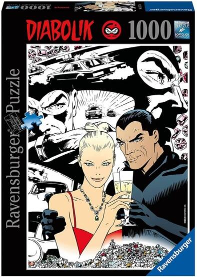 A Ravensburger  neve már hosszú évtizedek óta ismert az egész világon, mint a legkiválóbb minőségű puzzle játékok készítője. A kiváló termékminőség mellett a 2D-s és 3D-s puzzle kirakók rendkívül széles választékát nyújtja, mind a képi megoldások sokféleségében, mind pedig a puzzle részek darabszáma tekintetében. A  Ravensburger 1000 db-os puzzle - Diabolik  című képén az olasz képregény-sorozat két főhőse jelenik meg, Diabolik és Eva Kant .