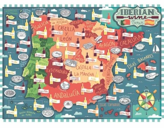 Ezen a Ravensburger 1000 db-os puzzle - Ibériai borok térképe (17608) kirakón egy rajzolt térkép látható, amivel eltudunk igazodni a spanyol borok világában.