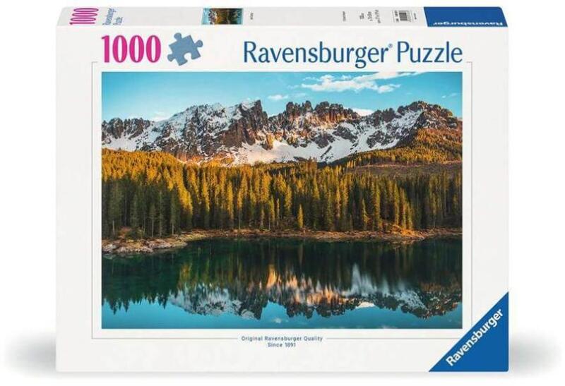 A Dolomitok gyöngyszeme elevenedik meg a Ravensburger 1000 db-os puzzle - Karer-tó, Olaszország (12001207) képén, a Karer-tó tükörsima vize csodás hegyekkel körülvéve. A természet szépségét hűen visszaadó, nyugtató kirakó.