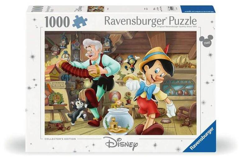 A bájos Disney-mese klasszikus pillanatait idéző, nosztalgikus hangulatú kirakó. A Ravensburger 1000 db-os puzzle - Pinocchio (12000108) tele van részletgazdag illusztrációval és meleg színekkel.