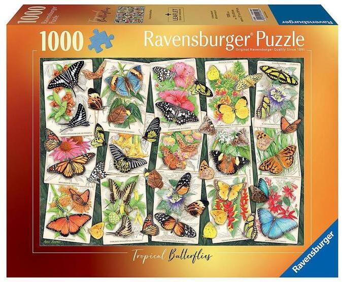 A Ravensburger 1000 db-os - Tropical Butterfly puzzle kirakott képén egy csodálatos pillangó montázs látható.