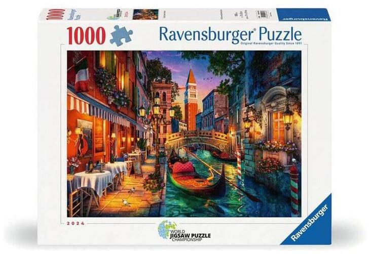 Fedezd fel Velence varázsát, ezúttal éjszaka a Ravensburger 1000 db-os puzzle - Velencei fények (12001439) kirakóval! A képen ikonikus városi részletek kelnek életre hangulatos megvilágításban.