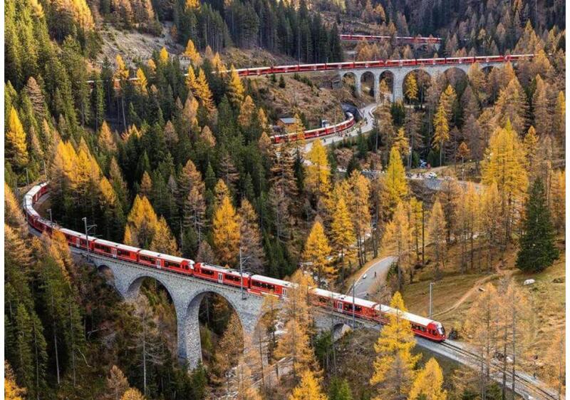 Kalandozz meseszép tájakon a  Ravensburger 1000 db-os puzzle - Csodálatos Svájc - RhB, a svájci vasút (12000004) kirakóval! A képen a híres svájci vasút lenyűgöző viaduktjait és szerelvényeit láthatjuk.
