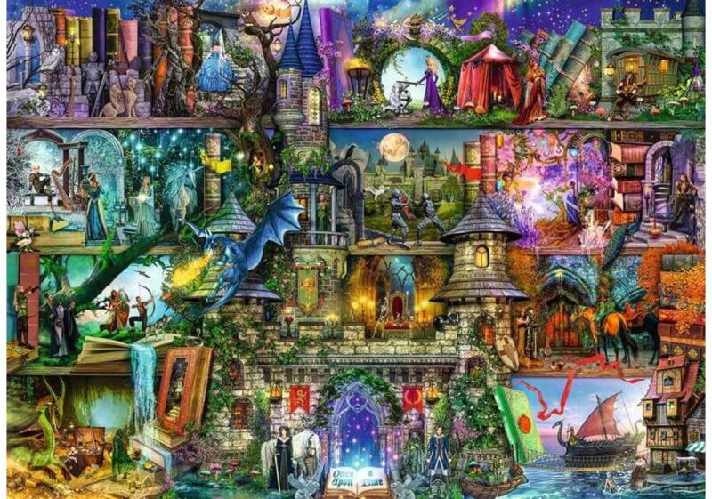 A Ravensburger 1000 db-os - Mítoszok és legendák című képén Aimee Stewart alkotása látható, ahol legendás szörnyek és hősök keltik életre a könyvespolcot.