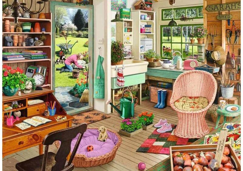 A Ravensburger 1000 db-os - Kerti fészer című kirakó a kerttészkedés szerelmeseinek készült. A hangulatos fészerben megtalálhatóak a kerti munkálatok legfontosabb kellékei: cserepek, öntöző kanna, gumicsizma, ásó, villa, lapát, virághagymák és még rengeteg egyéb csecse-becse.