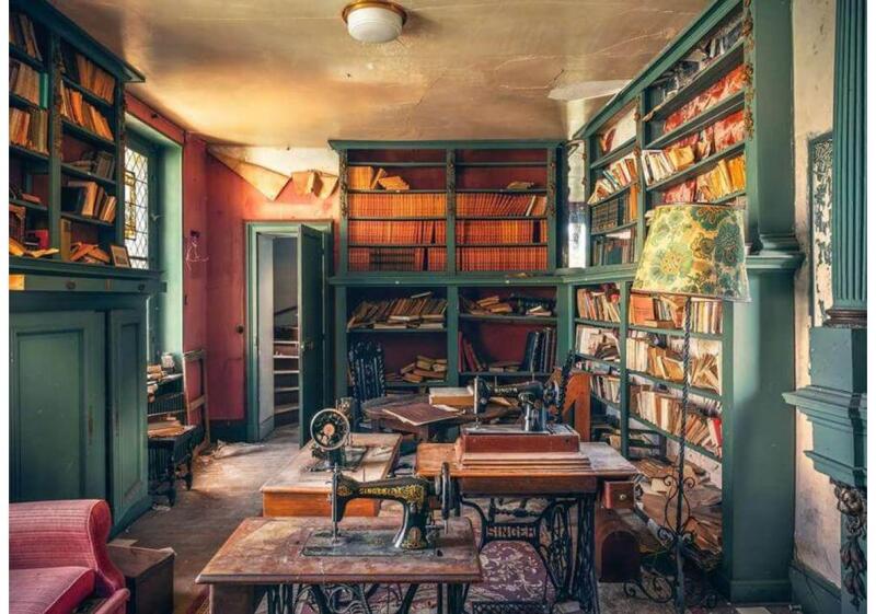 Elhagyott, poros könyvtár egy régi kastélyban. A Ravensburger 12000180 - Lost Places Edition - Titokzatos kastélykönyvtár - 1000 db-os puzzle képe a titkok és az elfeledett történetek világába vezet.