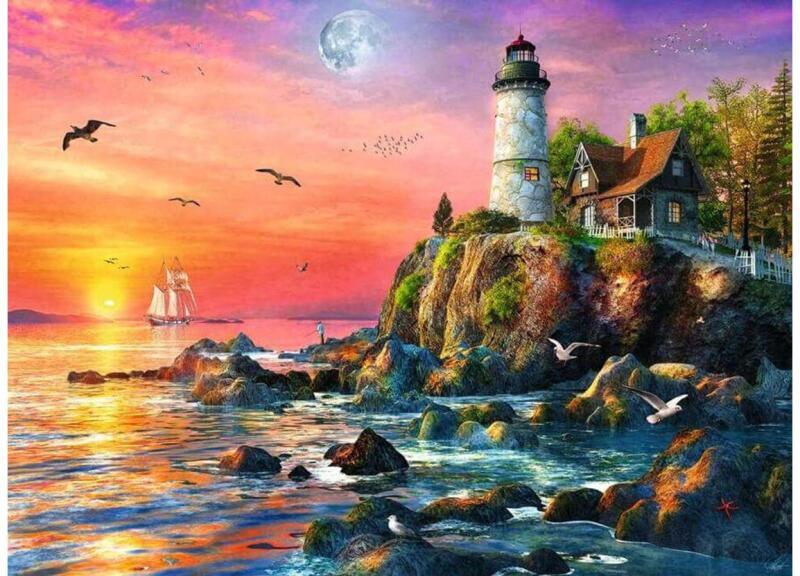 Festői part menti táj, középpontban a magasan álló világítótoronnyal. A Ravensburger 12000217 - Világítótorony - 500 db-os puzzle lenyűgöző képe megnyugtat és inspirál.