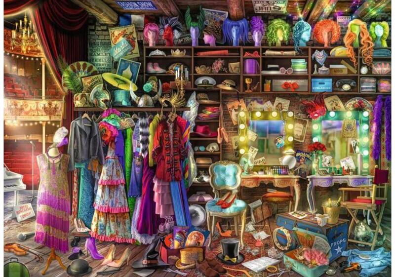 Ravensburger 1000 db-os puzzle - A szinház kulisszái mögött  kirakott képén egy igazán színes világ tárul elén, ami a kulisszák mögött vár. A színházi élet összes színe és jelmeze előbukkan ezen a kirakón.