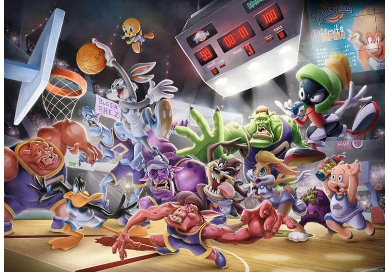 Ravensburger 1000 db-os puzzle - Space Jam  című képén a híres amerikai vígjáték jelenete látható, ahol a Looney Tunes csapata, élükön Tapsi Hapsi val az utolsó dobásba minden erejét beleadva győzelmet arat a marslakók felett.