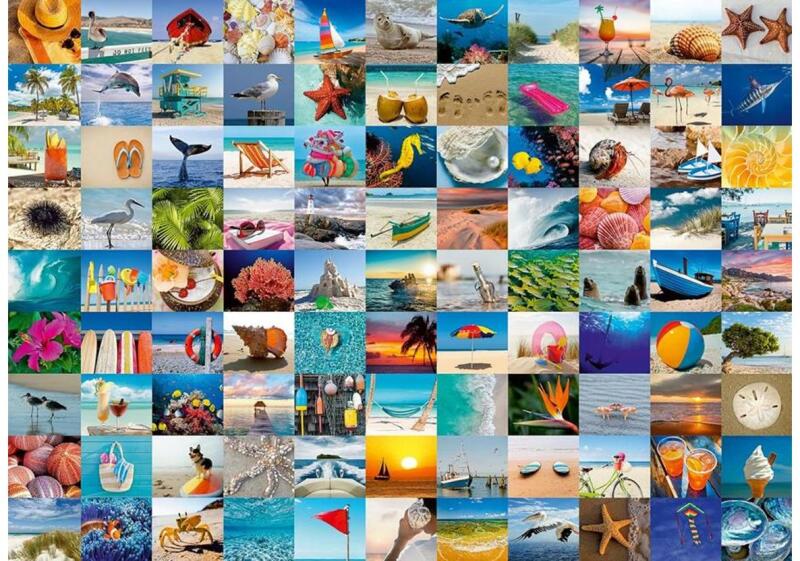 A Ravensburger 1000 db-os - 99 seaside moments  című képen tengeri állatok, tengerparti élmények, a családi nyaralás emlékei sorakoznak 99 színes képen összegyűjtve.