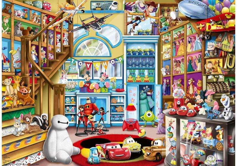 A Ravensburger  neve már hosszú évtizedek óta ismert az egész világon, mint a legkiválóbb minőségű puzzle játékok készítője. A kiváló termékminőség mellett a 2D-s és 3D-s puzzle kirakók rendkívül széles választékát nyújtja, mind a képi megoldások sokféleségében, mind pedig a puzzle részek darabszáma tekintetében. A  Ravensburger 1000 db-os puzzle - Disney játékbolt  képén egy Disney játékbolt látható az összes meseszereplővel.
