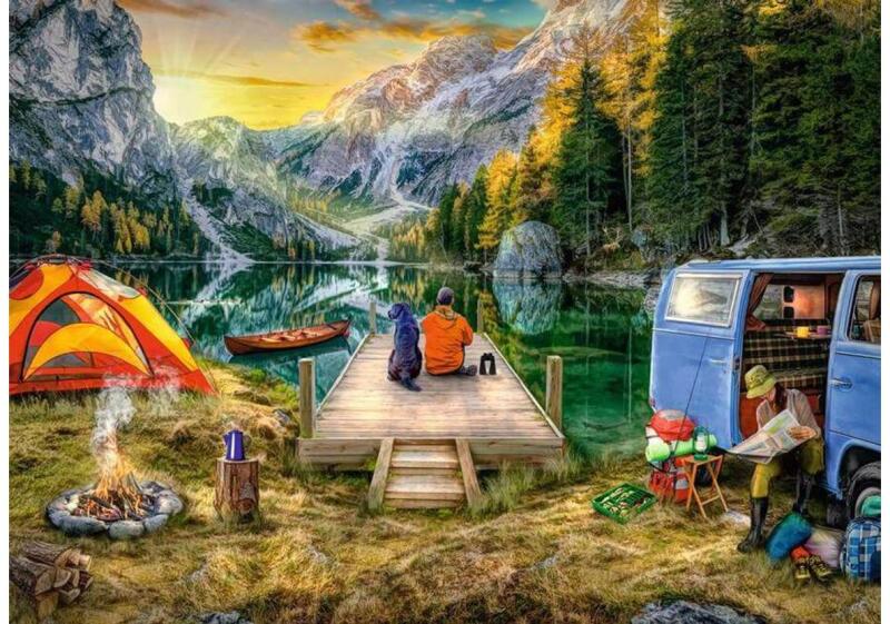 Vidám nyári táborozás az erdőben. A Ravensburger 12000568 - Kempingezés - 1000 db-os puzzle a természet és a szabadtéri élet örömét ábrázolja.