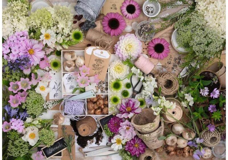 A Ravensburger 1000 db-os puzzle - Virágmánia (12000620) című kirakó képén egy hangulatos ültetőasztalt láthatunk, teli színpompás virágokkal és mindenféle kellékkel.