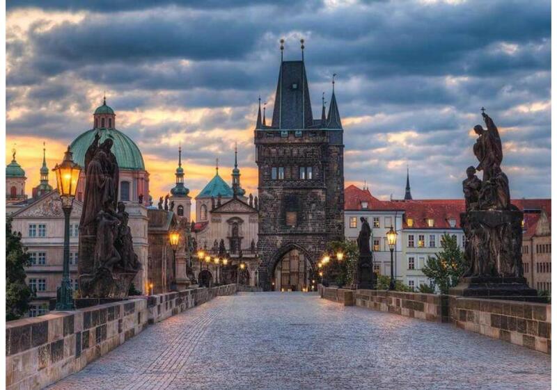 A híres prágai híd, gyönyörű részletekkel. A Ravensburger 12000673 - Séta a Károly hídon, Prága - 1000 db-os puzzle képével mi is érezhetjük a történelmi város varázsát.